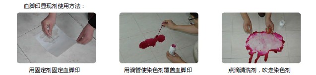 將清洗劑點滴在腳印的中心部位,用吹氣球把多余的 染色劑吹出腳印的范圍,潛血腳印就顯露出紅色的印 跡。 |